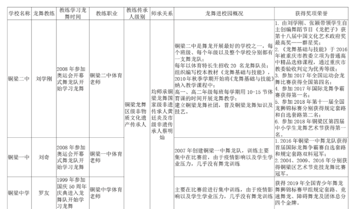 目前,铜梁龙舞进校园已经在全区100 多所中小学开展相关课程,铜梁龙舞作为独特的传统文化教学资源,既是体育,又是美育,同时还具备德育的因素,符合当下提倡五育并举的教育理念,既可以强身健体,又能够提高审美水平,还培养了学生团结协作的精神,有助于学生的全面发展。铜梁龙舞进校园以铜梁二中、铜梁职教中心、铜梁中学校、铜梁一中以及重庆巴川中学为代表,探索出了各具特色的教学方法。根据笔者实地调研分析如下表: